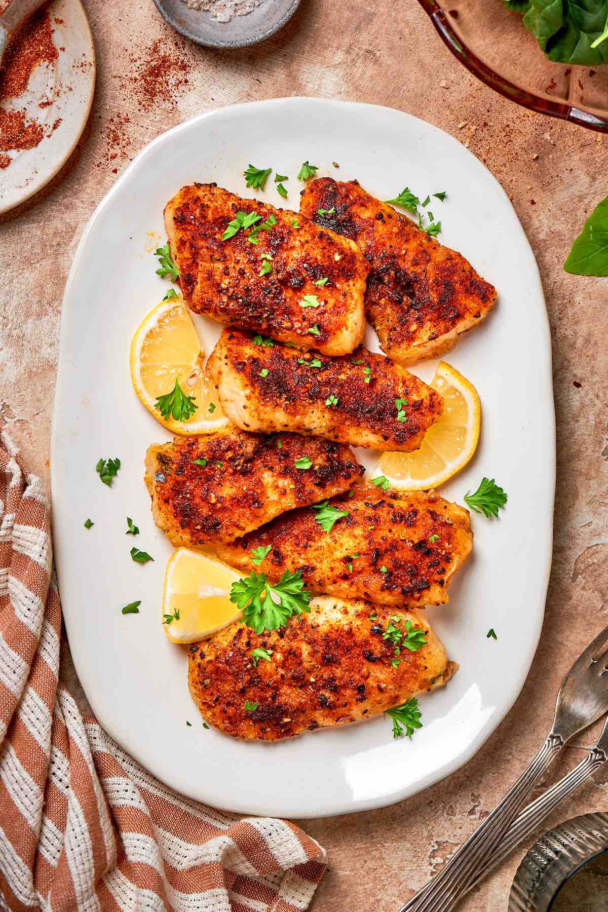 - Olive oil. A little fat helps the spices adhere to the fish and also helps crisp up the edges.
