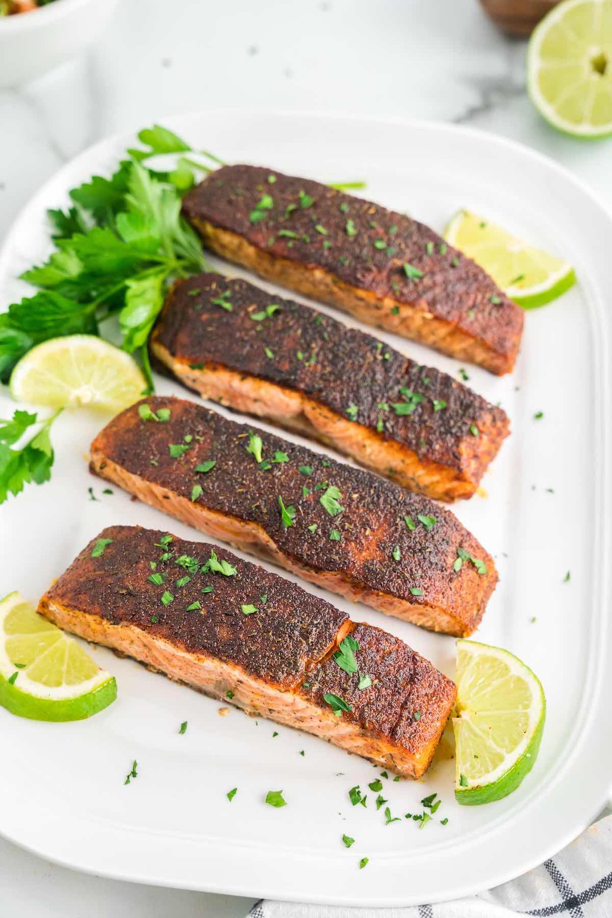 You can, but I can’t vouch for the flavor or how well it adheres to the salmon. I meticulously tested this recipe to find the ideal spice combination for four servings (which can easily be scaled up). If you use a store-bought brand, aim for 2 1/2 tablespoons of blackened seasoning per four salmon fillets.