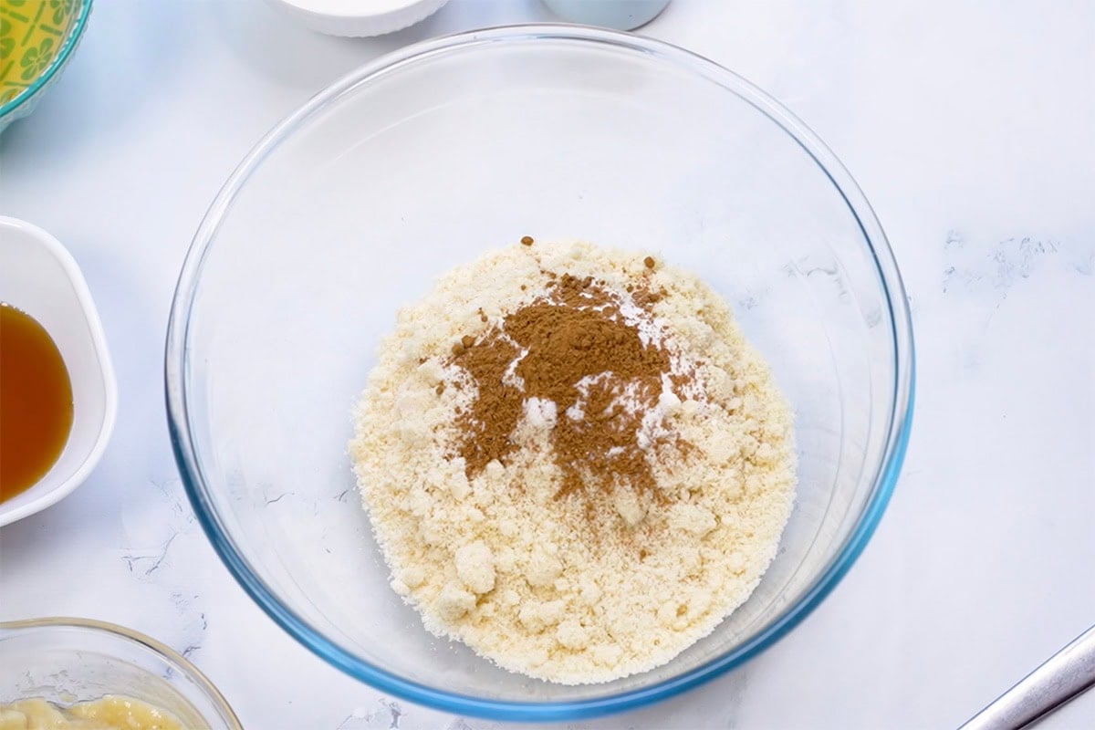 - In a large bowl, mix the coconut flour, almond flour, baking powder, baking soda, and cinnamon, and set aside. In a separate bowl, add the mashed bananas, maple syrup, and vanilla extract and mix until combined.