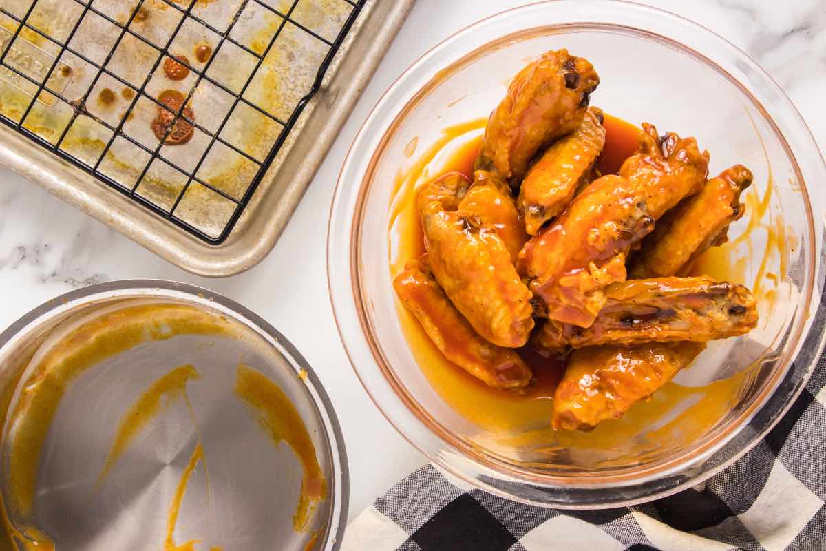 Step 4- Place the wings and sauce in a large mixing bowl and toss to coat.