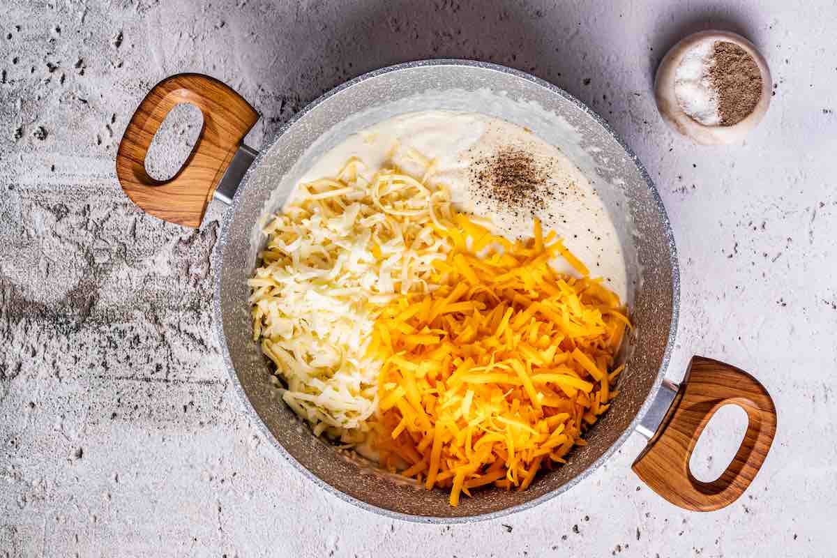 • In a small saucepan, add the heavy cream and place it over medium heat. Once the cream begins to simmer, reduce to low. Add the shredded cheeses, salt, and pepper, and let them melt into the cream. Stir for 4-5 minutes until thick and smooth.