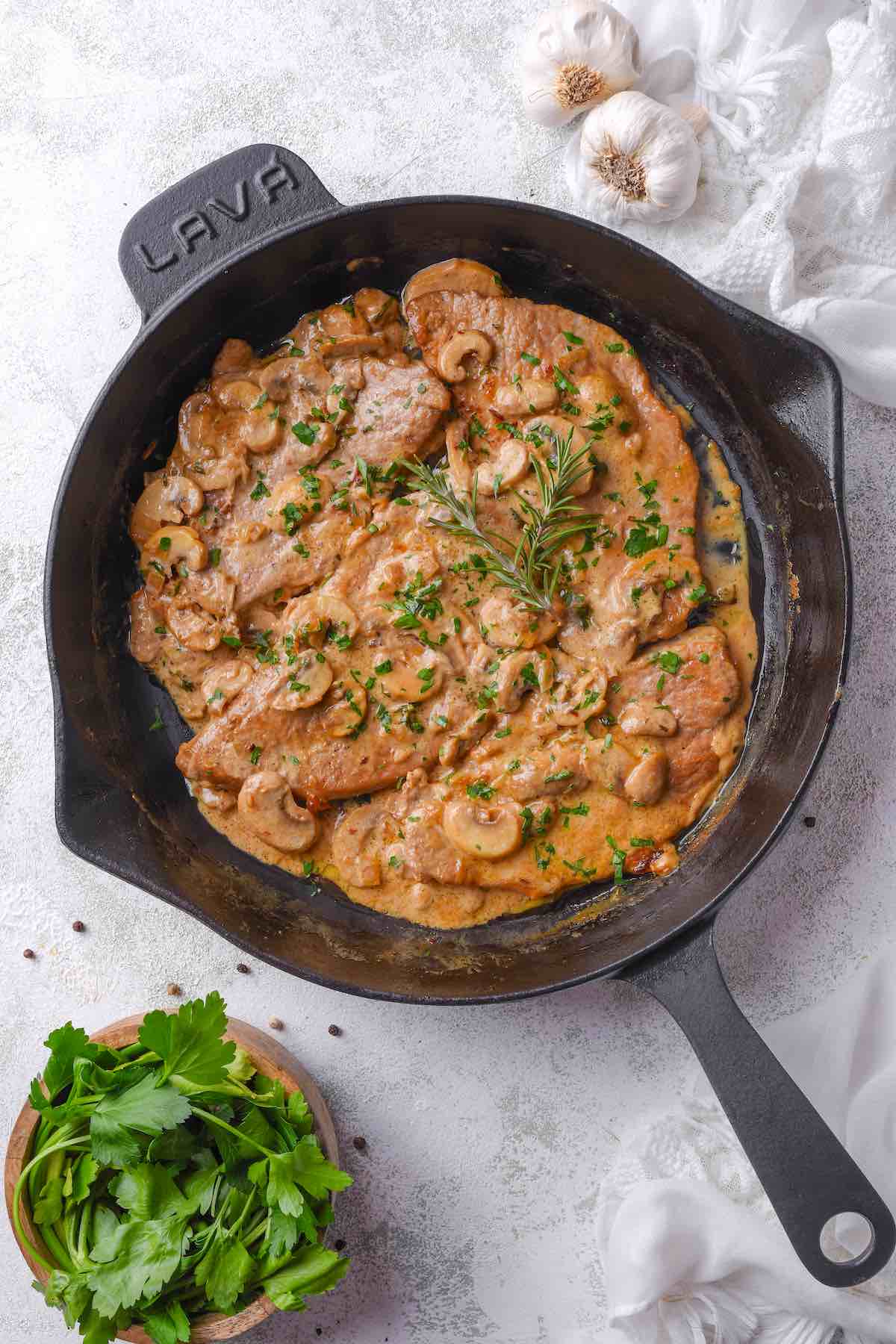 - Add the heavy cream, rosemary, and thyme. Place the veal cutlets back in the sauce and simmer for 5 minutes.